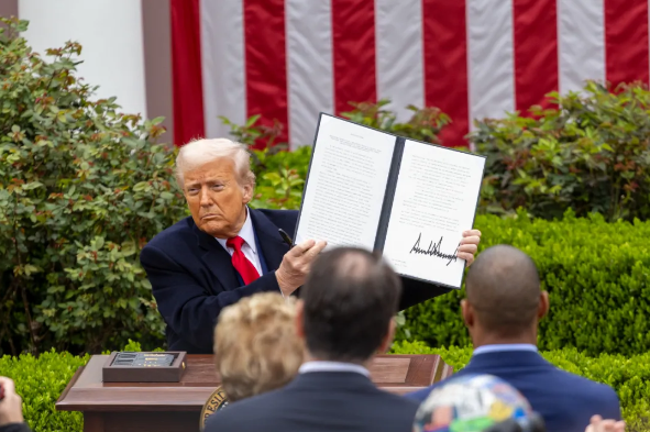 4月2日,美国总统特朗普在首都华盛顿白宫展示签署后的关于所谓“对等关税”的行政令。新华社记者胡友松摄